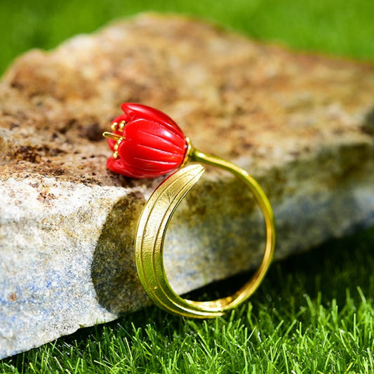 Anello Giglio della Valle in Argento 925 e Corallo Rosso