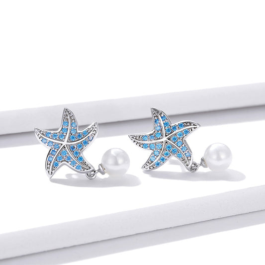 Brincos Estrela do Mar em Prata 925 e Zircônias com Pérola Natural